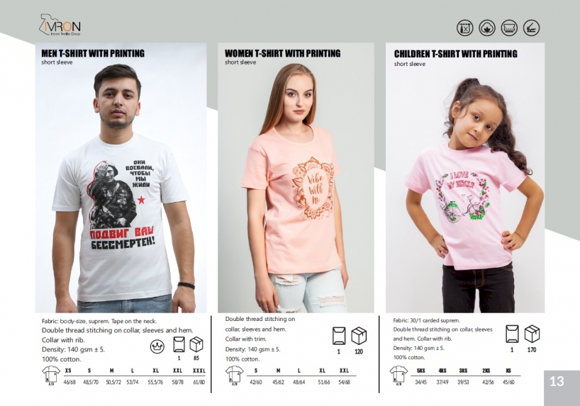 We offer t-shirts, sweatshirts, T-shirts with long and short sleeves, with or without printing, and other jerseys on request in accordance with GOST 31405-2009, GOST 31408-2009, GOST 31410-2009.