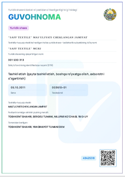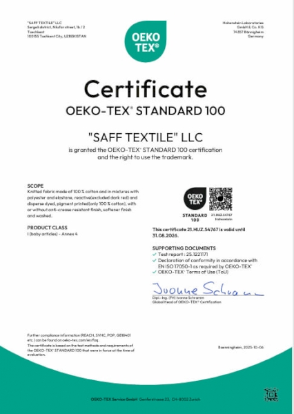 The SAFF TEXTILE company was founded in 2010 in Tashkent, the Republic of Uzbekistan. It is a manufacturer and seller of plain dyed and printed knitted fabrics in a wide range, as well as braids, cords, elastic bands.
